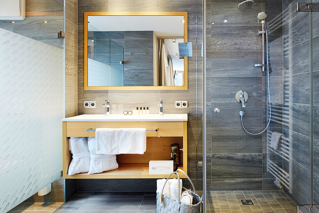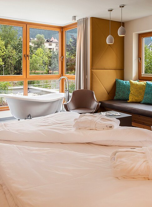 Ankommen. Loslassen. Auftanken. Fast wie zu Hause, aber doch ganz anders. In der Panorama Junior Suite genießen Sie nicht nur den herrlichen Weitblick auf die umliegenden Gipfel, sondern können auch indoor entspannt abtauchen. Ob in der freistehenden Badewanne oder auf dem gemütlichen Nischensofa – come in and (re)treat yourself.