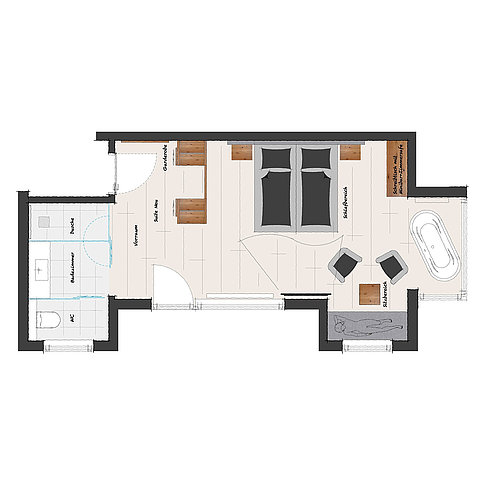 Doppelbett (Boxspringbett mit Gesundheitsmatratze) | Twin Betten möglich | kuschelige Sitzecke | freistehende Badewanne im Zimmer | Balkon mit Sitzgelegenheit | TV | Telefon | WLAN | Minibar (nicht befüllt) | Safe | Wellnesstasche mit Bademantel, Handtüchern & Slipper | Allergiker Bettwäsche | Teppichboden | Dusche | WC | Fön | Radio