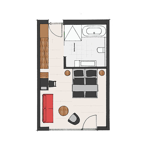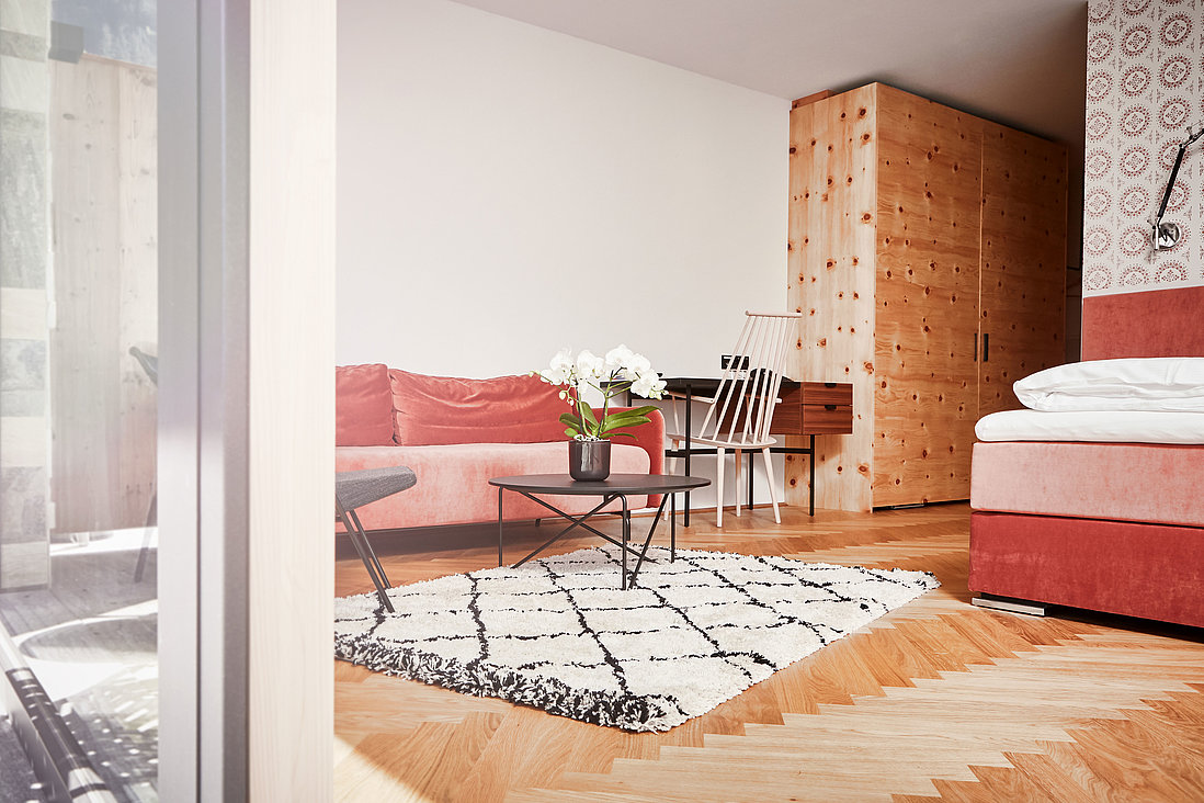 Let yourself go - because in our modern Boutique Junior Suites you are guaranteed to land softly. The scent of Swiss pine has a calming effect and the velvety soft sofa is perfect for lazing around on bad weather days.